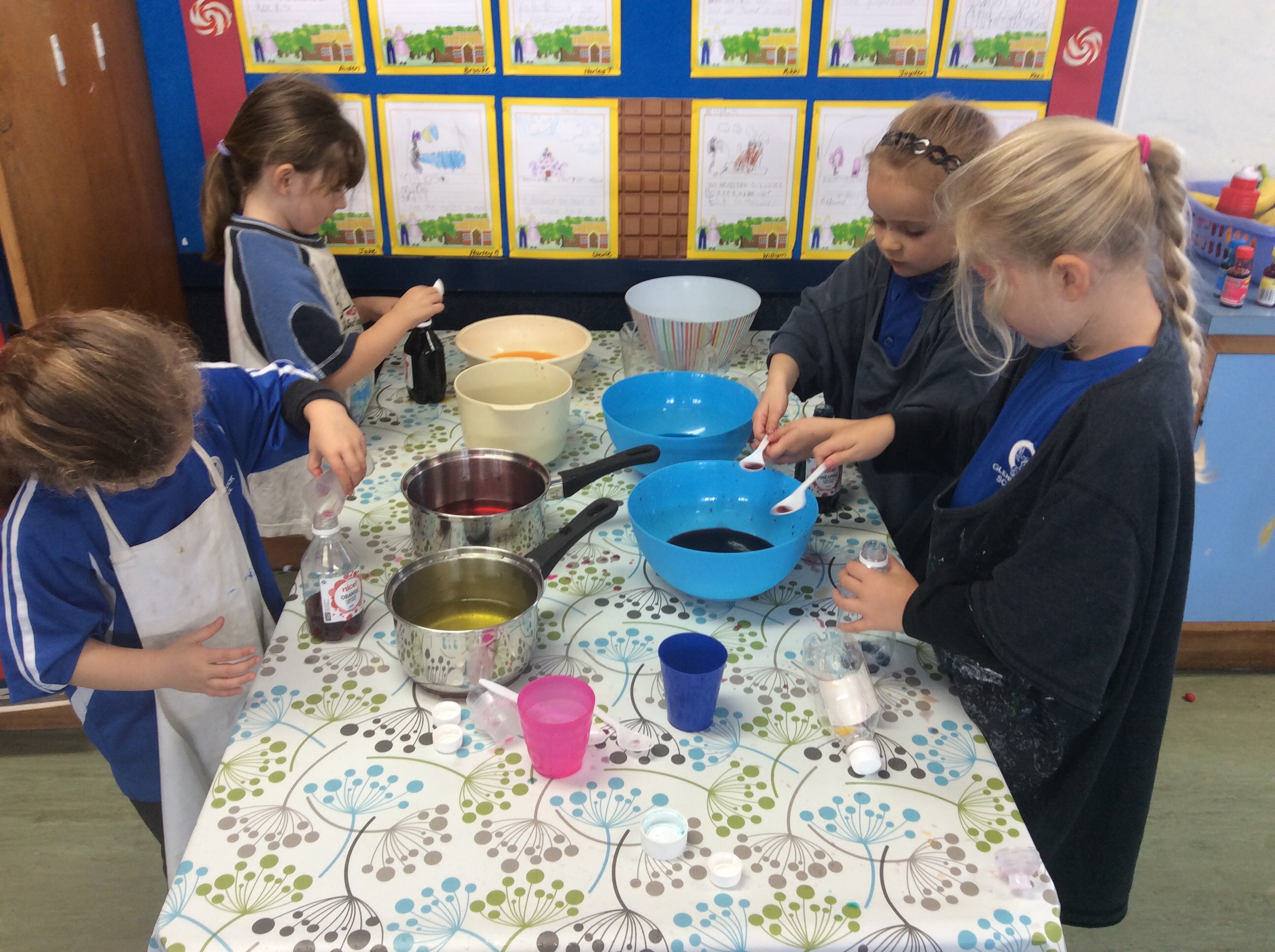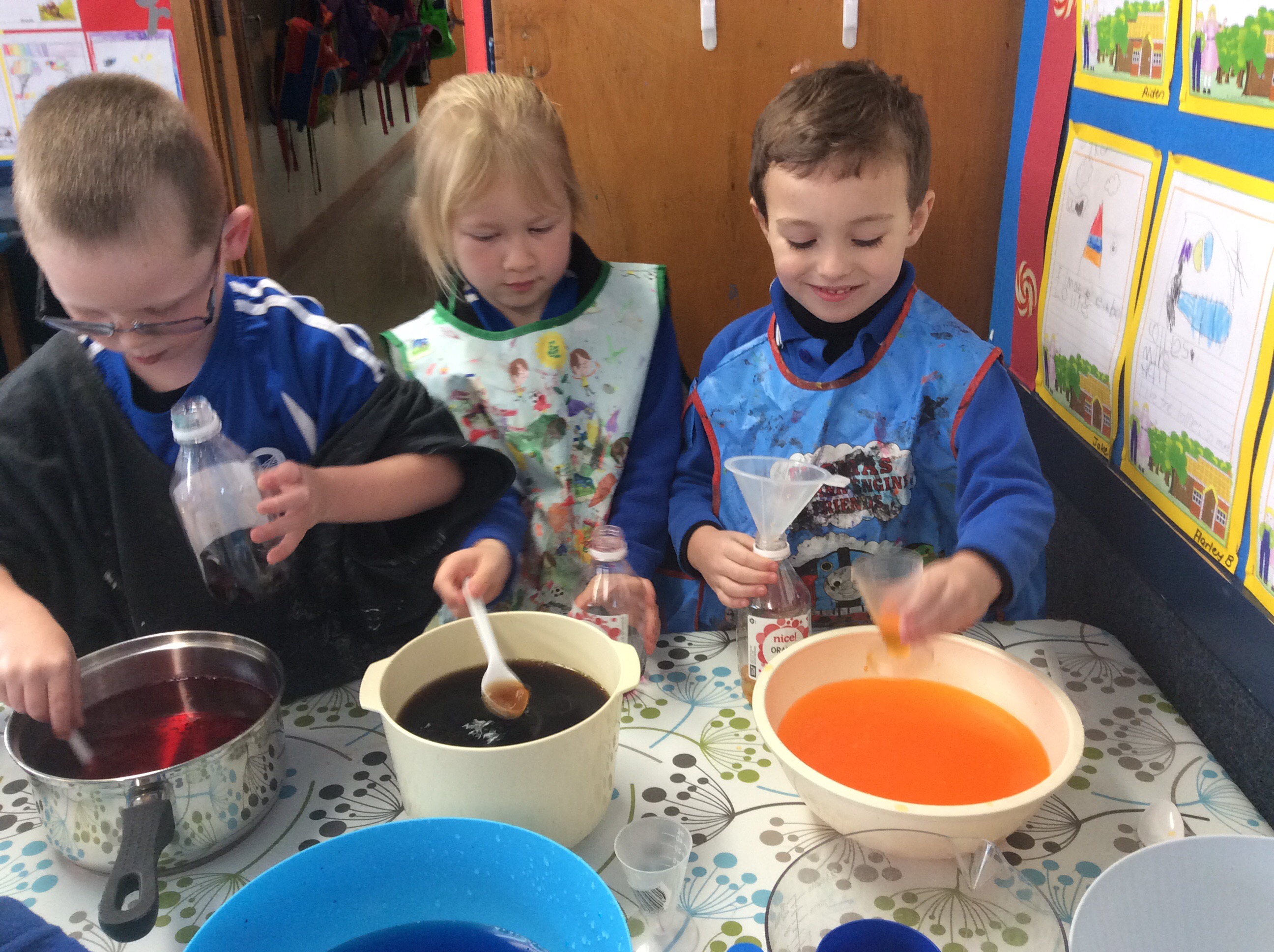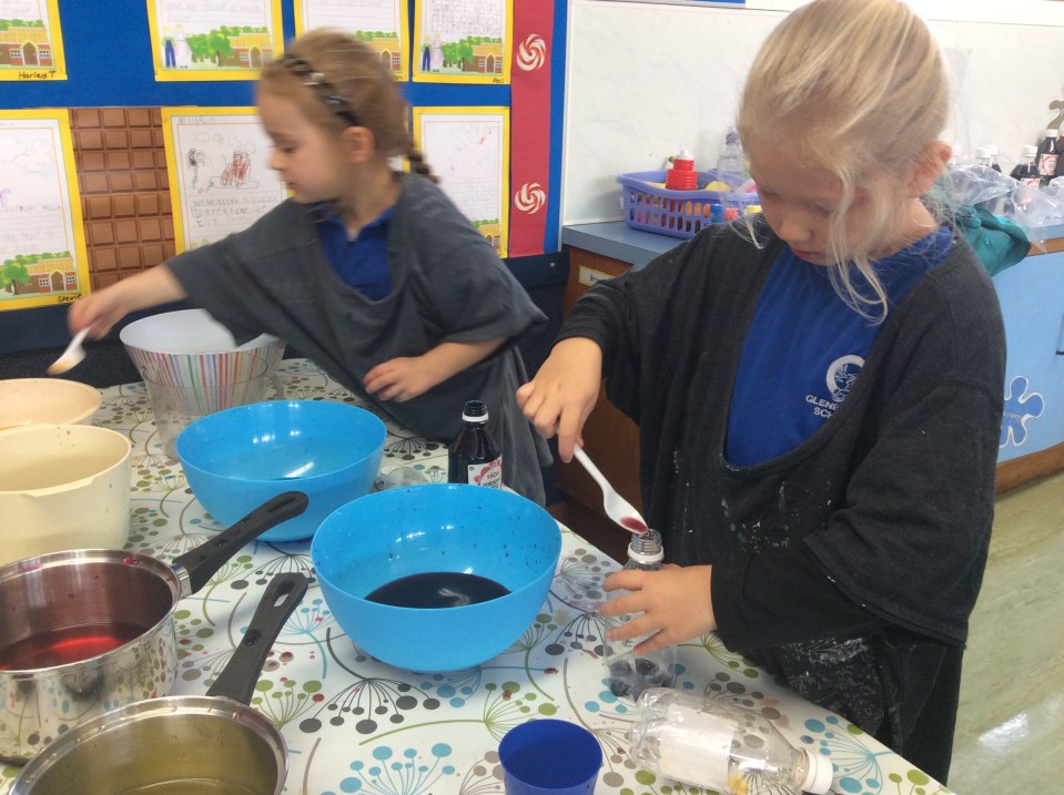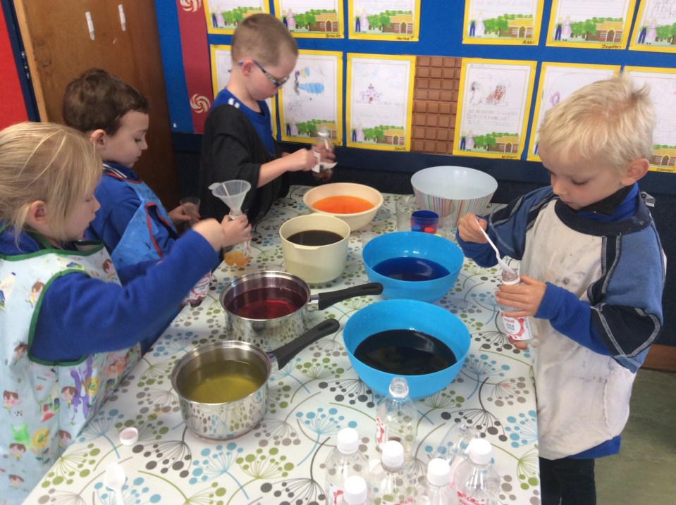 So…..the wolf has eaten Grandma, Little Red Riding Hood and a whole cake. Now he has a sore tummy, so we have made our own potions to make him feel better. Messy fun in Parekereke today