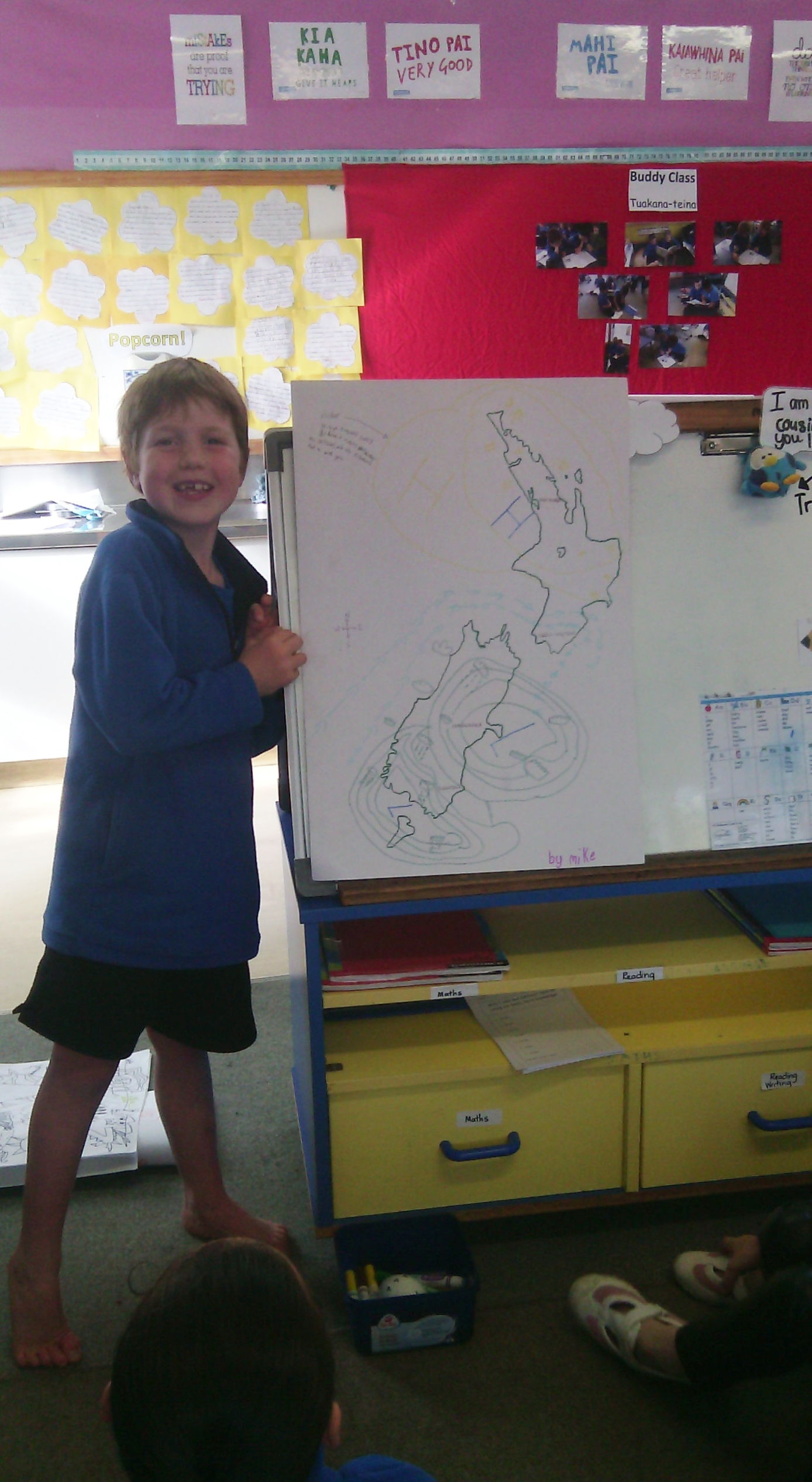 Michael shared his very own weather report with Uenuku. He had chosen to do it as one of his homework tasks. Michael had drawn a map of New Zealand and labelled the weather patterns. He explained to the class what the weather was like in different parts of the country. Well done Michael!